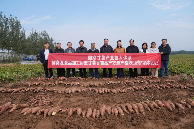 2025年10月24日,国家甘薯产业研发中心组织有关专家对济宁市农业科学研究院(国家甘薯产业技术体系济宁综合试验站)牵头在泗水创建的鲜食及加工型甘薯百亩高产方进行实地测产验收。随机抽取百亩高产方5个测产点进行现场收获称重。经折算:示范方种植的鲜食型品种济薯26鲜薯亩产4214.1公斤,比常规种植增产59.9 %,商品薯率提高16.1 %,均超额完成了高产方创建的任务指标。