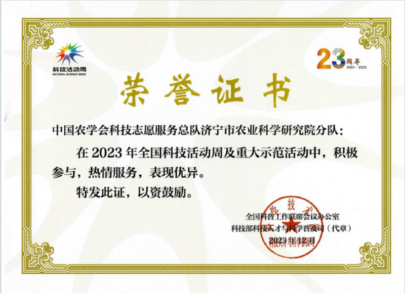 济宁市农科院获2023年全国科技活动周及重大示范活动表彰