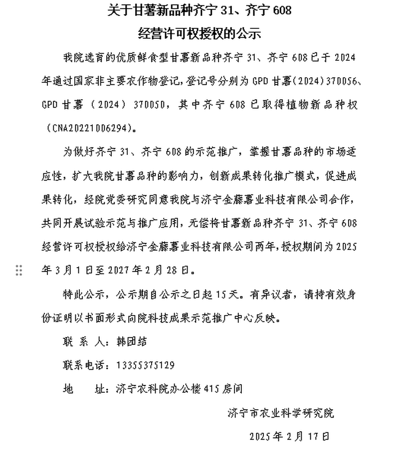 关于甘薯新品种齐宁31、齐宁608 经营许可权授权的公示